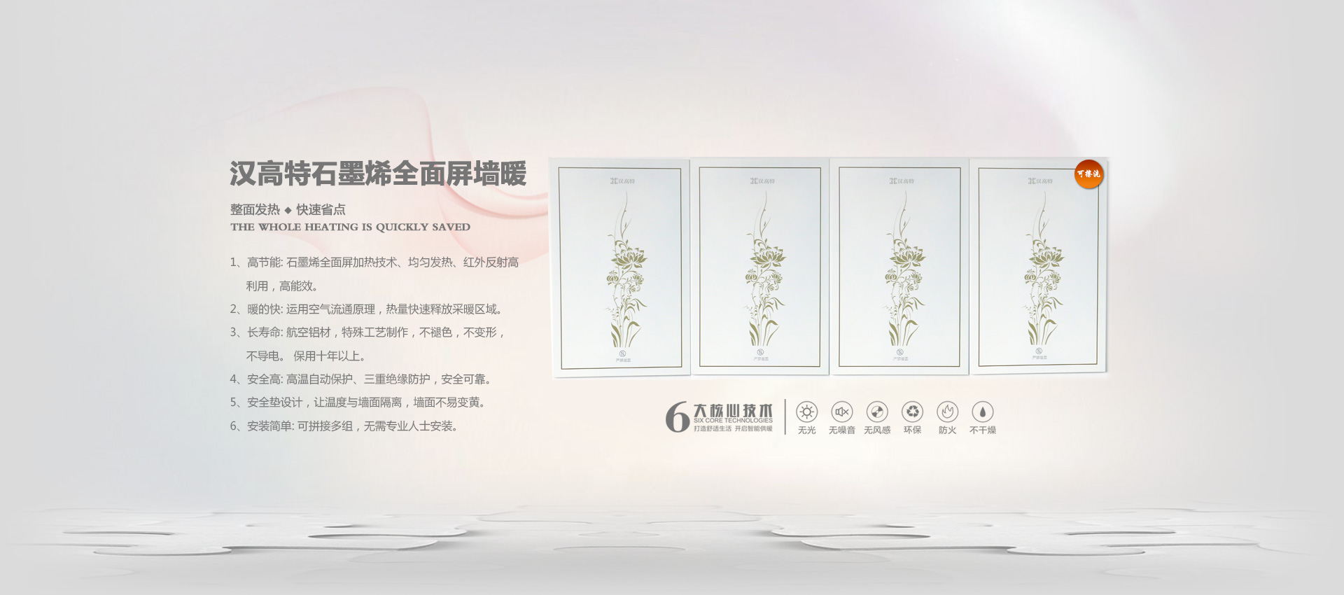 漢高特自主研發(fā)的新型石墨烯電地暖、石墨烯電采暖、電熱膜電地暖、碳纖維電暖、碳晶墻暖畫、電地暖廠家加盟、電熱膜工廠,采用新設(shè)計(jì)、新材料在行業(yè)內(nèi)首創(chuàng)了耐強(qiáng)酸、耐強(qiáng)堿、防火阻燃、防水防潮等特點(diǎn)。產(chǎn)品暢銷江蘇、四川、甘肅、山西、河北、河南、內(nèi)蒙、新疆等地。